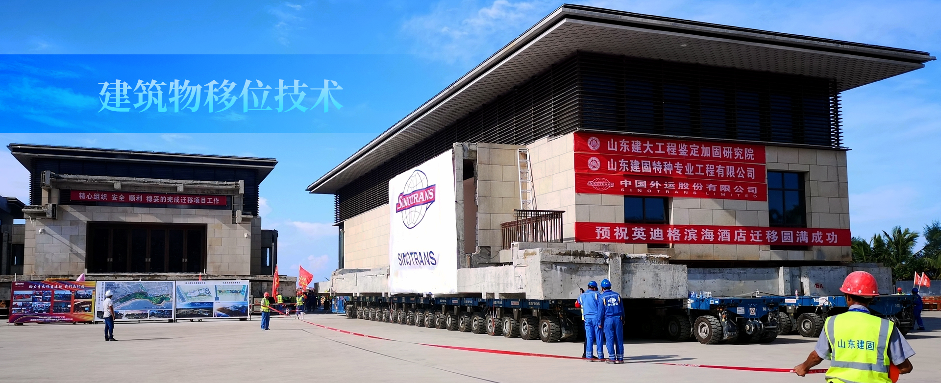 海南紅塘灣酒店為地下1層、地上2層鋼筋混凝土框架結(jié)構(gòu)。占地面積約2400㎡,總建筑面積4658㎡。遷移直線距離約500米,豎向頂升2.3米。紅塘灣酒店遷移工程的成功就位,標(biāo)志著一個(gè)新的記錄誕生:目前國(guó)內(nèi)外首例不規(guī)則扇形車輛布置、國(guó)內(nèi)拖車移位單體建筑面積最大(4658㎡)、國(guó)內(nèi)拖車移位單體建筑重量最重(7500噸)。山東建筑大學(xué)工程鑒定加固研究院、山東建固特種專業(yè)工程有限公司成立于1992年,三十年一直秉承“篤志疑難躬行求新”的企業(yè)精神,完成建筑物鑒定與加固改造、建筑移位、建筑糾傾項(xiàng)目六萬余項(xiàng)。山東萊蕪高新區(qū)辦公樓平移項(xiàng)目,建筑面積24000㎡,重量35000噸,是國(guó)內(nèi)外最重平移工程;主持完成的